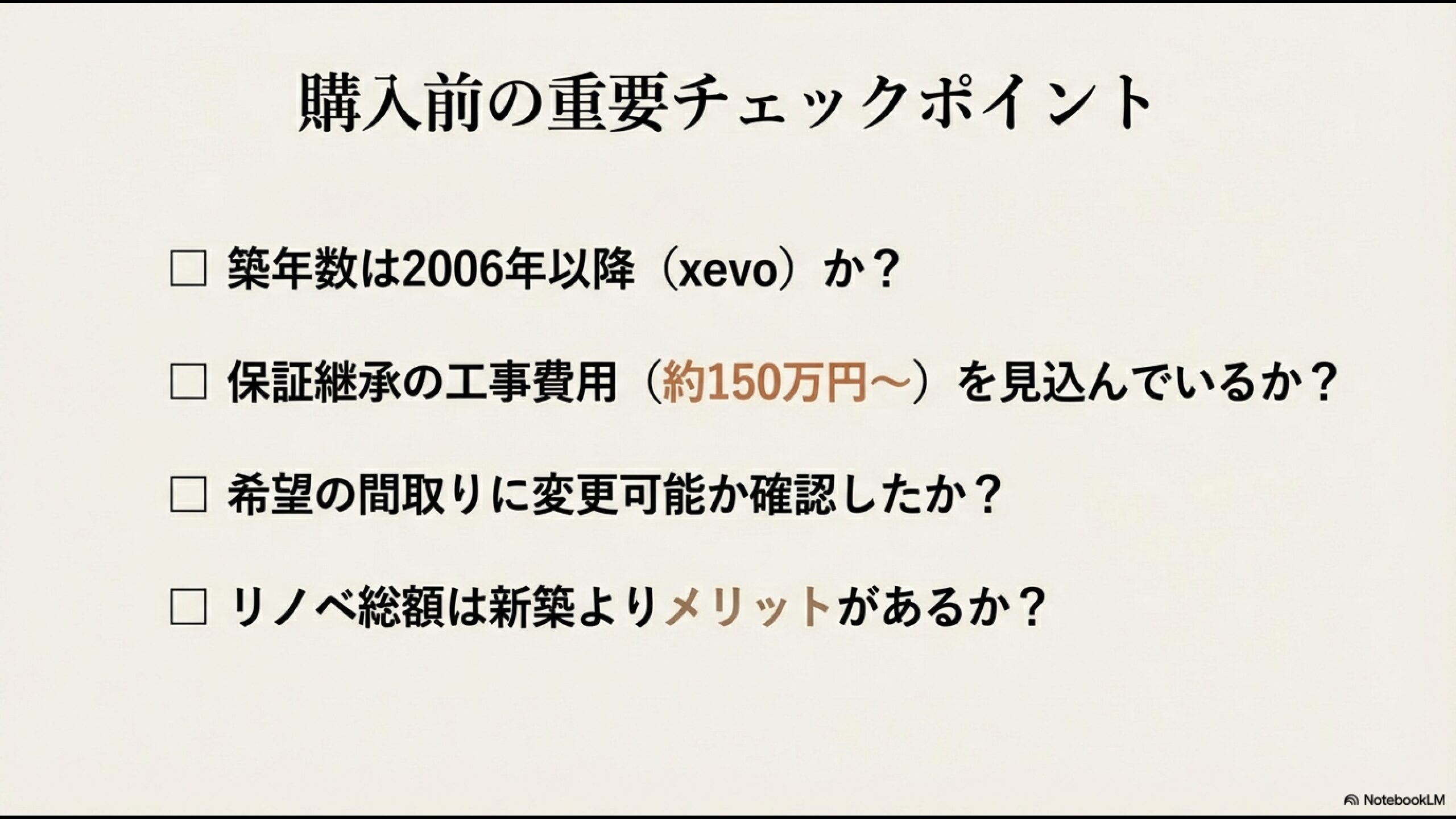 もし、あなたが検討している物件が「xevo」シリーズであれば、構造躯体の劣化リスクは統計的に見ても低く、リノベーションのベース(素材)としても非常に優秀だと言えます。