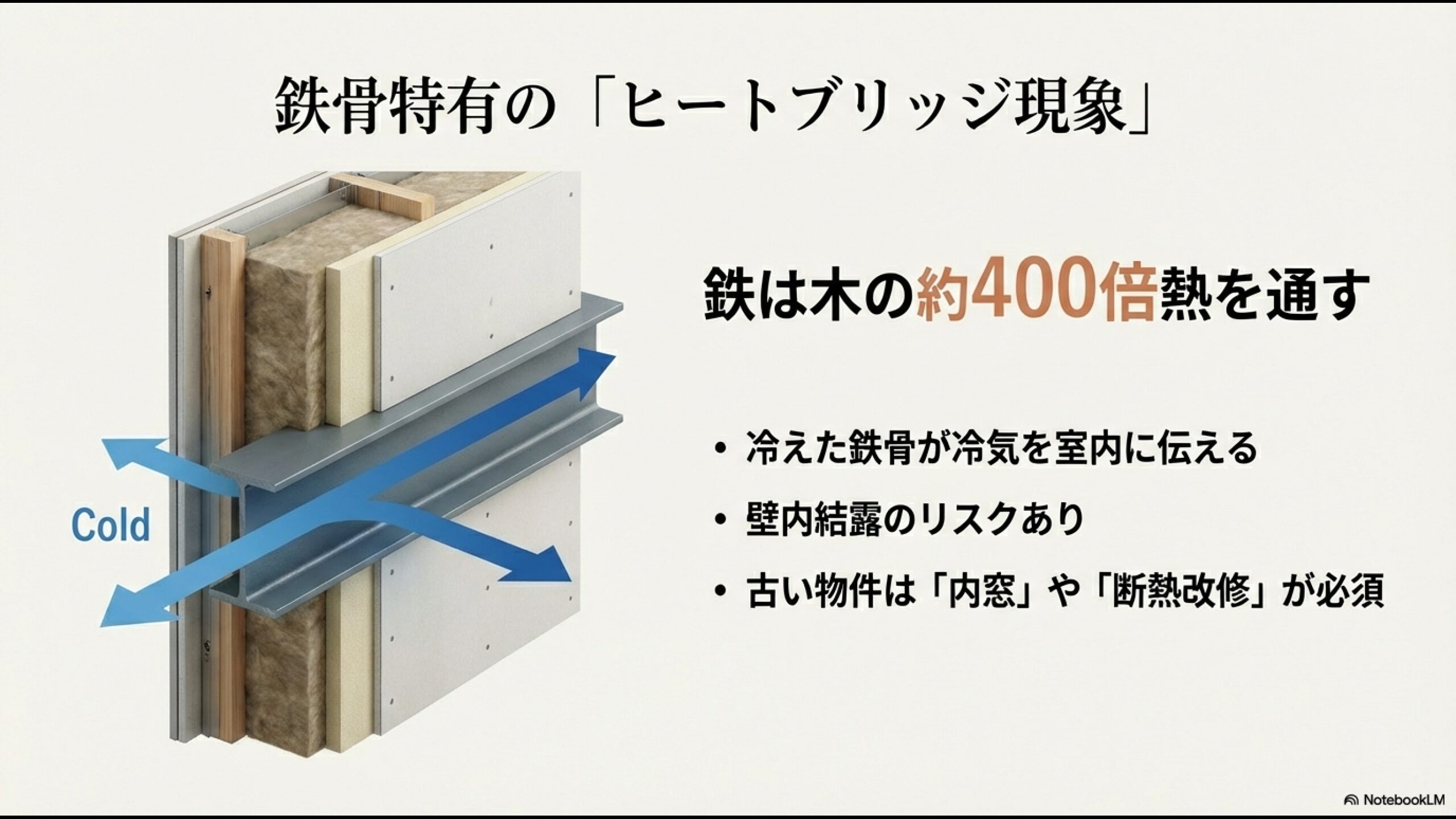その根本的な原因は、構造材である鉄という素材の熱伝導率にあります。