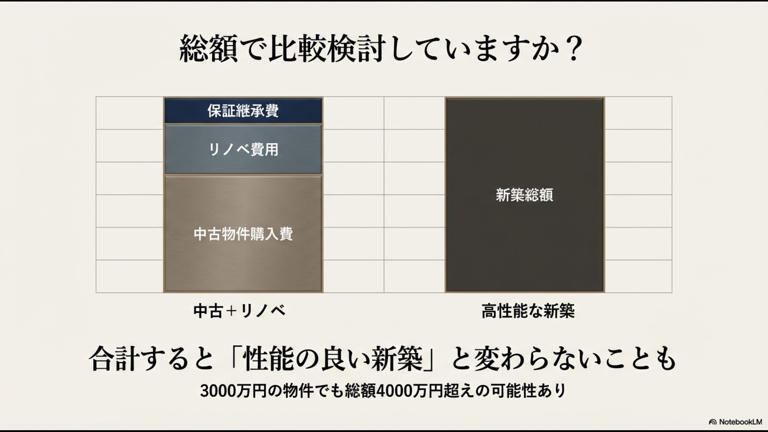 「中古物件の本体価格」+「諸費用(仲介手数料など)」+「リノベーション費用(断熱・水回り・内装)」+「保証継承の有償工事費」...。