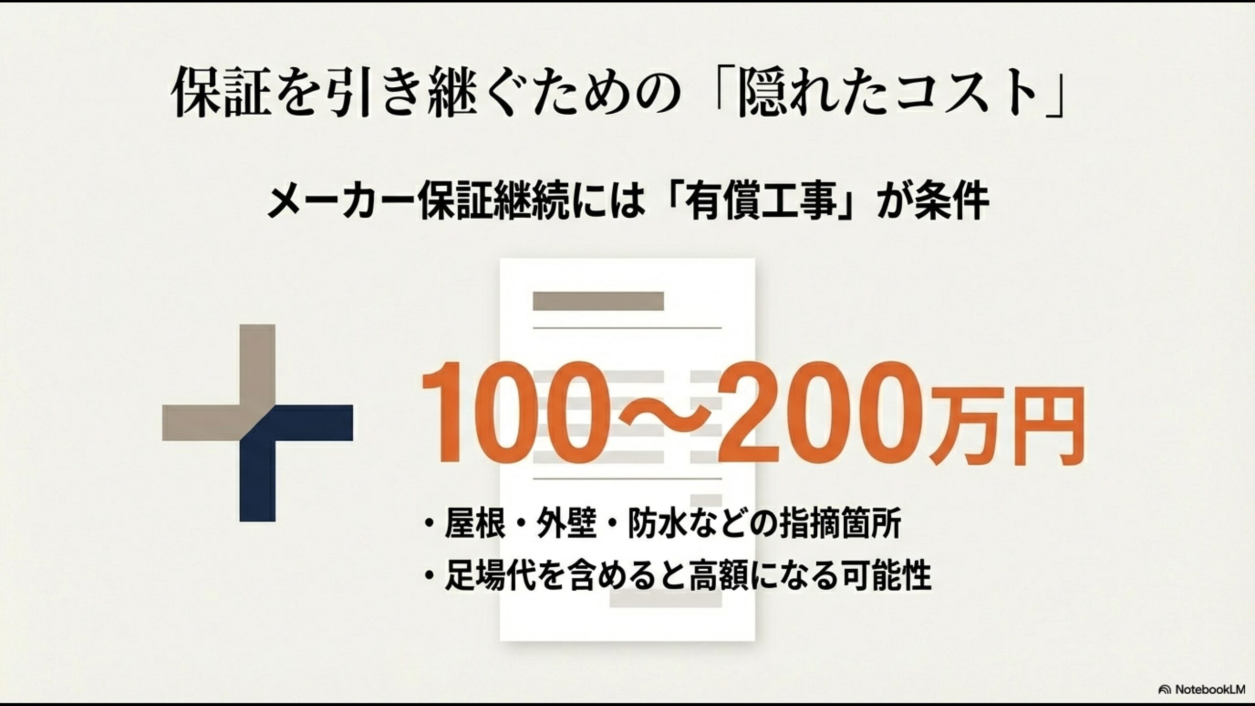名義変更だけでなく、メーカーによる点検(有料の場合あり)を受け、指摘された不具合箇所(屋根、外壁、防水など)の有償補修工事を行うことが保証継続の条件となるのが一般的です。