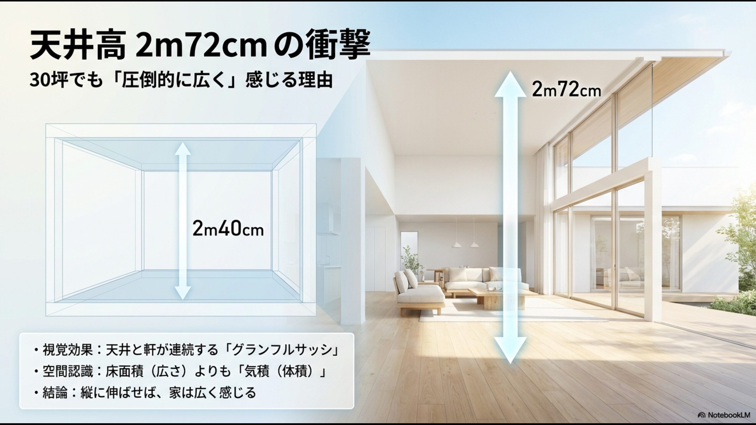 部屋に入った瞬間に感じる天井までの高さ、つまり空間の「気積(きせき=体積)」によって、感じる広さは大きく変わります。