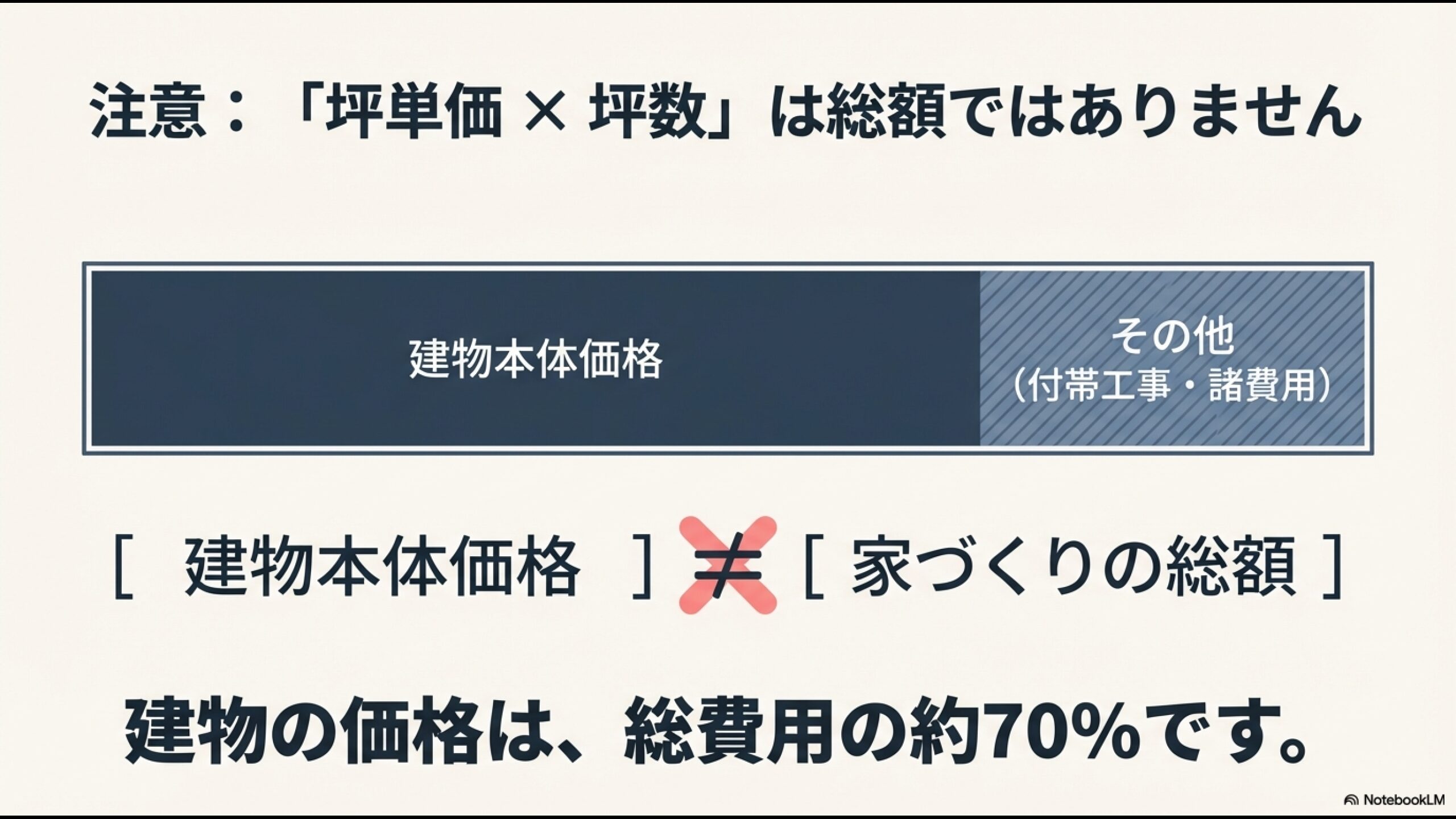 多くの人が家づくりで陥る最大の罠、それが「坪単価 × 坪数 = 家の値段」だと思い込んでしまうことです。