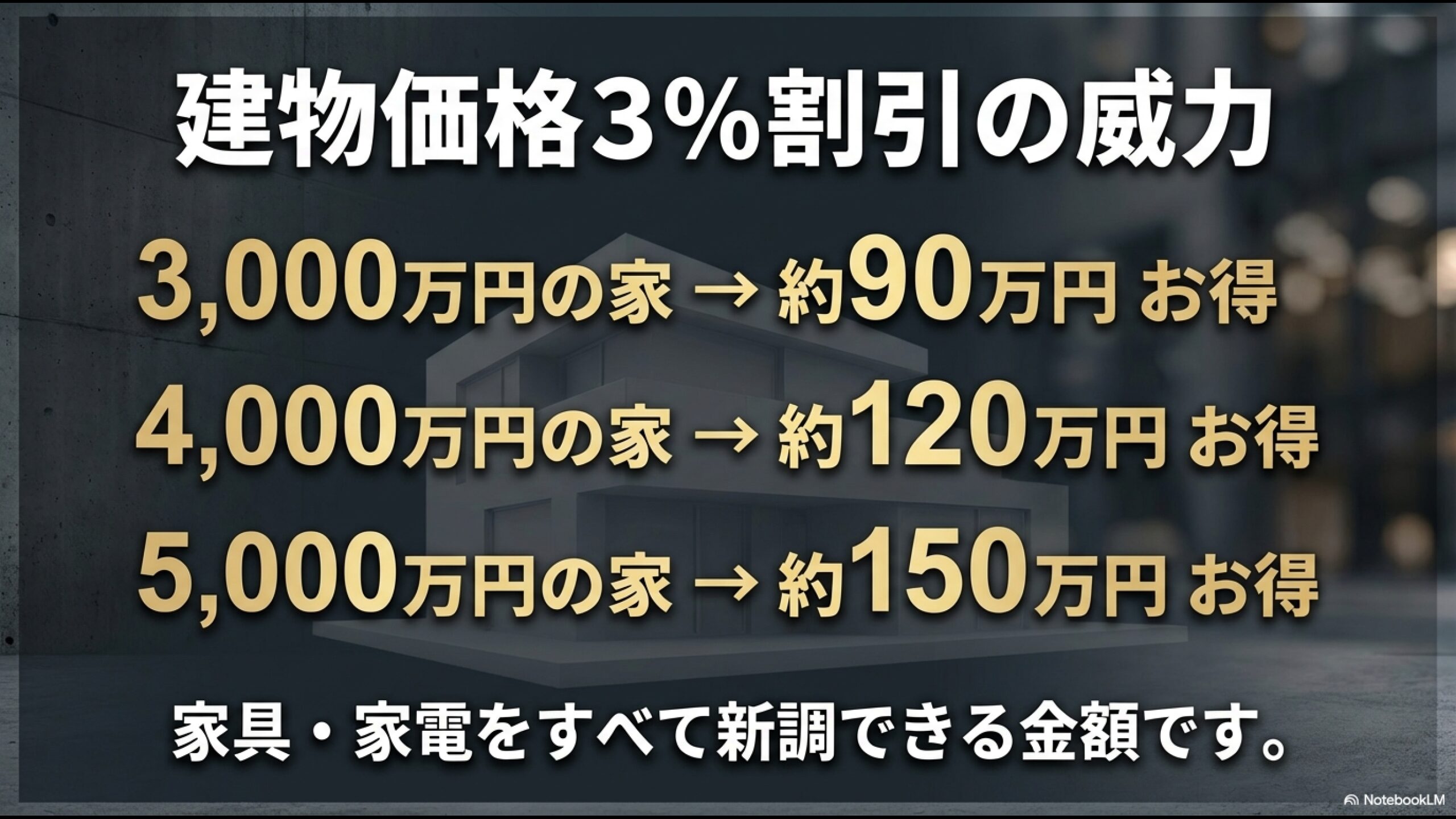 仮に、建物本体価格が3,000万円、4,000万円の家を建てる場合、3%相当の割引がどれだけのインパクトを持つか計算してみます。
