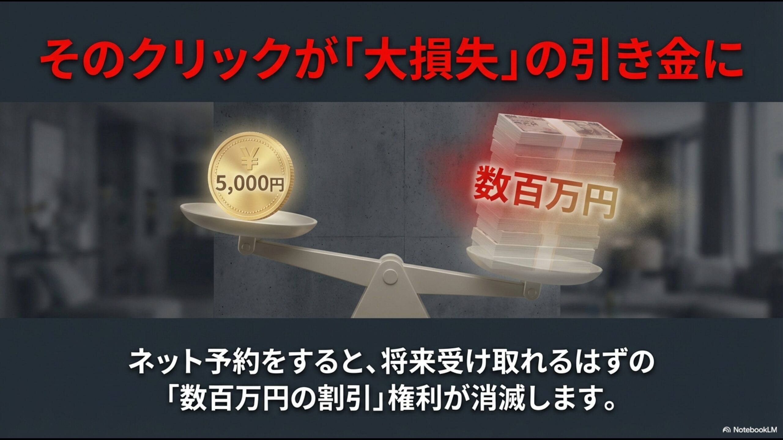 つまり、目先の数千円のQUOカード欲しさに軽い気持ちで予約ボタンを押した瞬間、将来受け取れるはずだった100万円近い割引、もっと言えば「新しい家具や家電を揃えられる予算」を、自らの手でドブに捨ててしまったことになるのです。