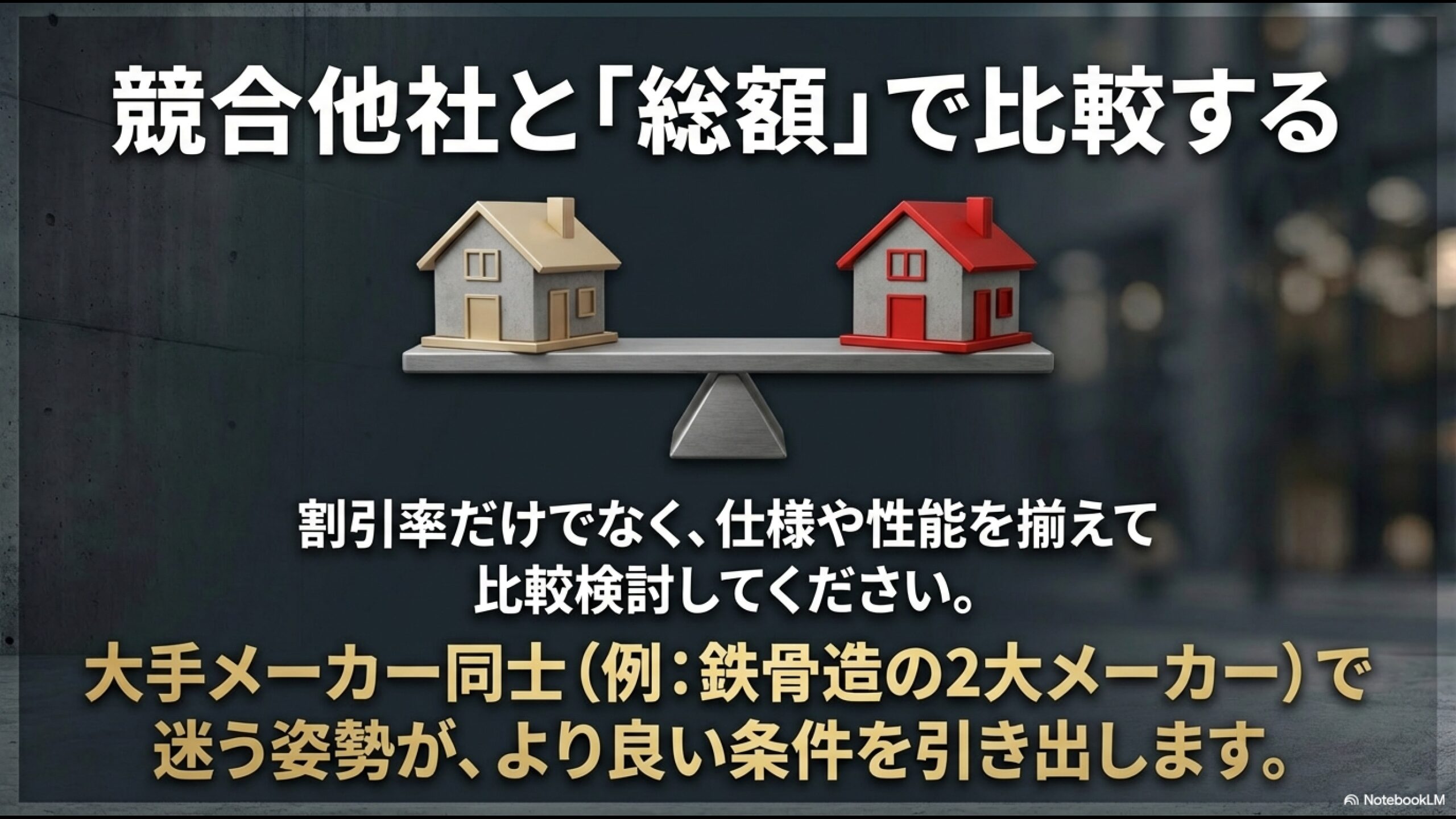 - 仕様と条件を揃えて、積水ハウスなどの競合他社と正しく比較し、有利な条件を引き出す交渉術
