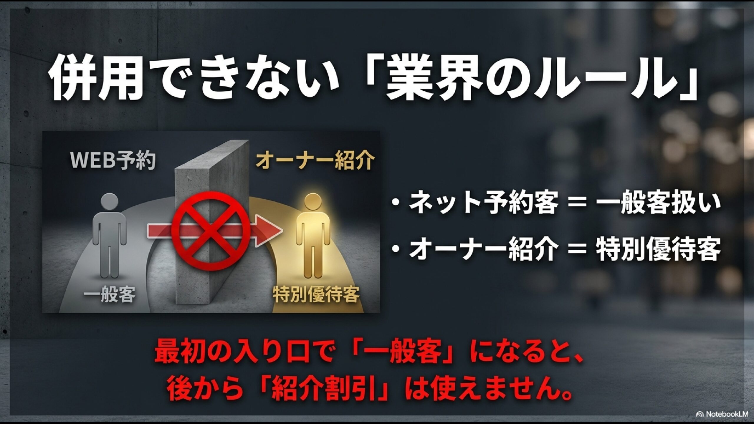そして最大の問題は、原則として「WEB予約特典」と「紹介割引」は併用できない(排他利用)というルールがあることです。