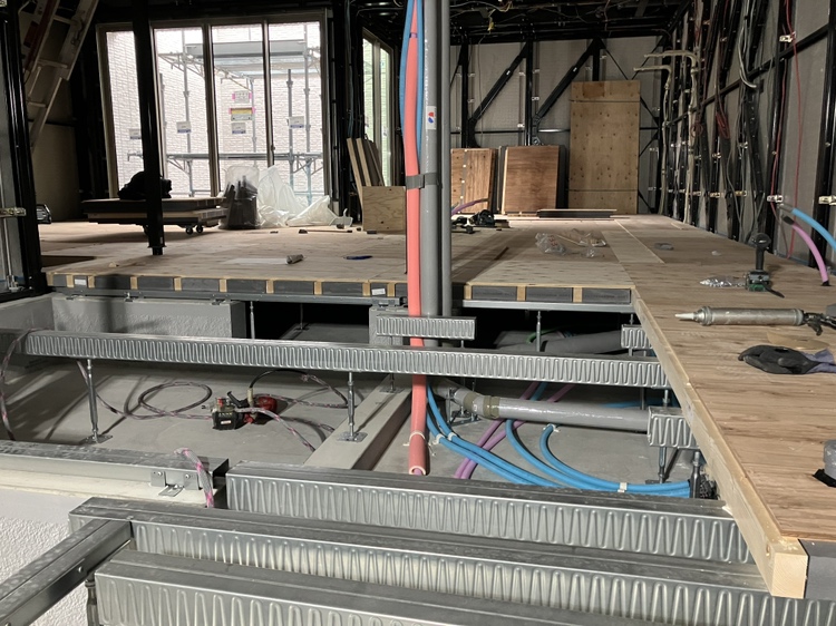 床の下地となる、鋼製大引きと断熱材付きの床パネルの施工中写真や、天井配線の写真をアップいたします。