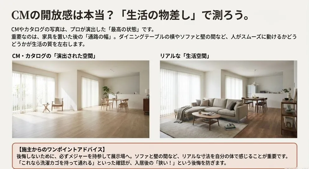 「CMのような広々とした空間」を鵜呑みにせず、必ずメジャーを持って展示場に行き、実際の距離感を測りまくることが、後悔しない家づくりの第一歩ですよ。