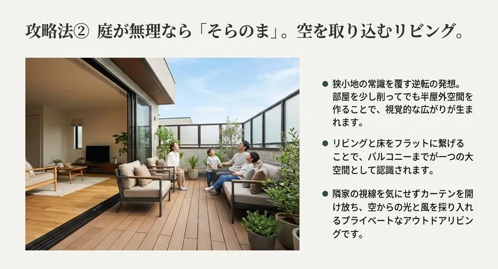「狭小地でも3階建て」「屋上でバーベキュー」「空とつながるアウトドアリビング」