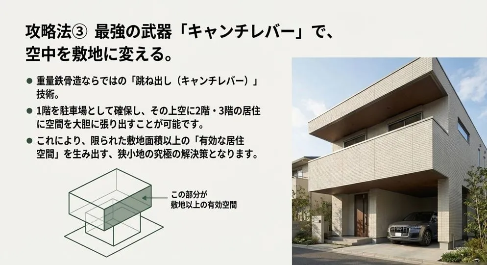 1階の駐車場の上部に、2階・3階部分が大胆にせり出した(跳ね出した)ヘーベルハウスの外観写真と構造概念図。重量鉄骨造の強みを活かし、敷地以上の有効な居住空間を創出する様子を描いている