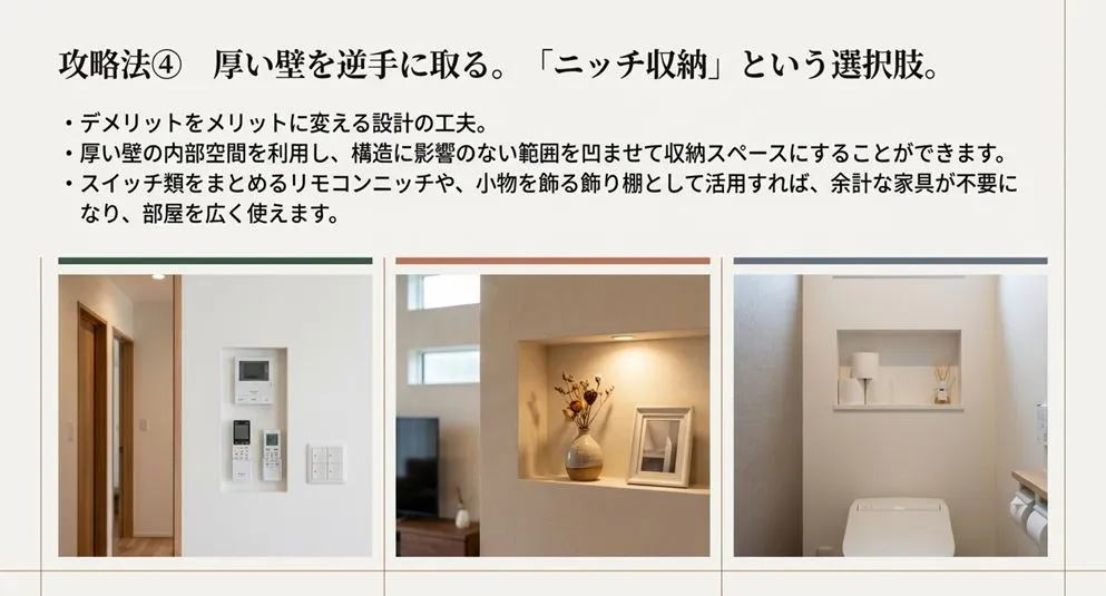 トイレの壁面を一部凹ませて作られたニッチ収納の写真。トイレットペーパーや小物をスマートに収めることで、空間を圧迫せずに利便性を高める「デメリットをメリットに変える工夫」を紹介している