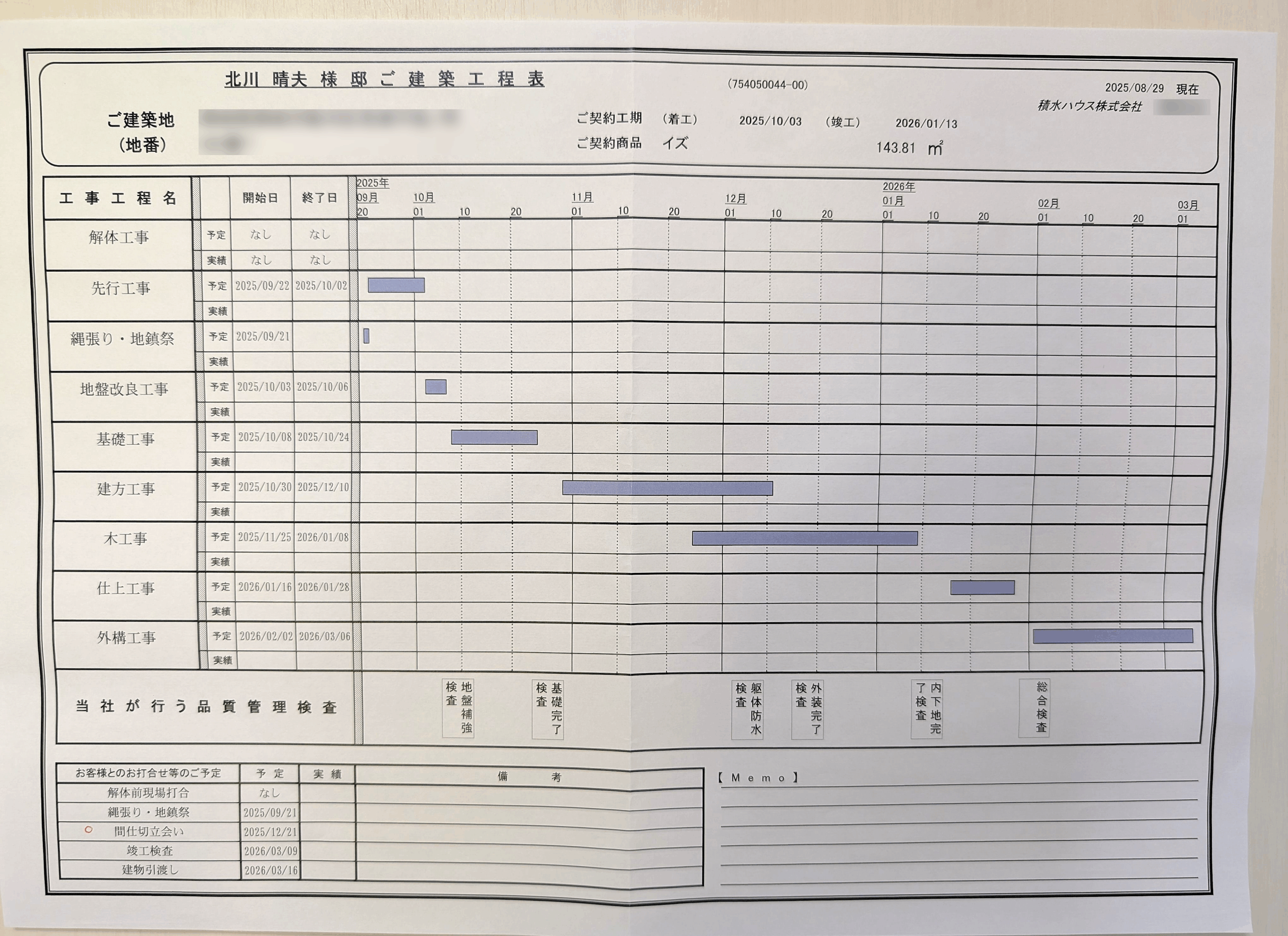 契約後、橋爪さんと富田さんから正式な工事の工程表を出していただきました。