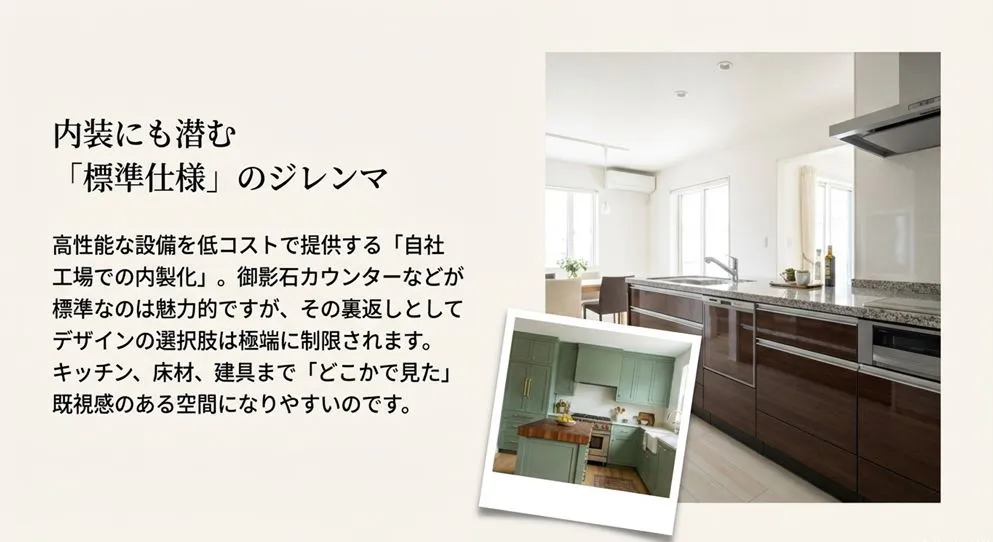 「汚れにくい」というメンテナンス性や、「地震に強い」という耐震性を極限まで追求した結果、デザインの遊びや複雑さが削ぎ落とされ、結果として「量産型」のような印象を与えてしまう。