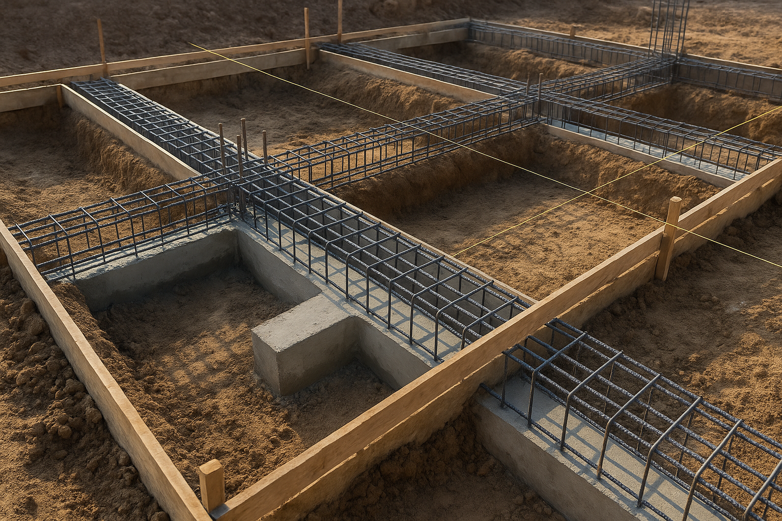 - 布基礎:建物の柱や壁が乗る主要な部分に沿って「線(Tの字を逆さにした形)」で支えるイメージです。ベタ基礎に比べて、深く、頑丈な基礎を造ることができます。