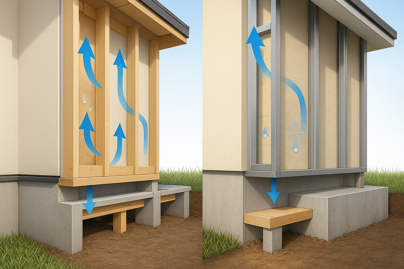 この空気の流れによって、壁内部の湿気を排出し、断熱材を乾燥状態に保ちます。