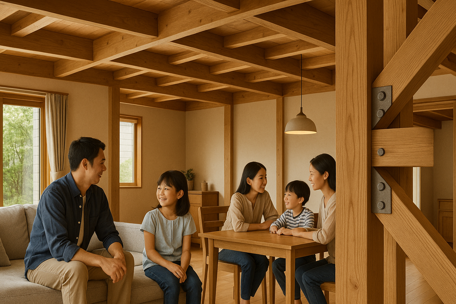 - 🔗 伝統的な軸組工法を独自に進化させた「MJ(メタルジョイント)接合システム」による、設計の柔軟性と強度の両立。木造でも高い耐震性と自由な間取りを実現します。