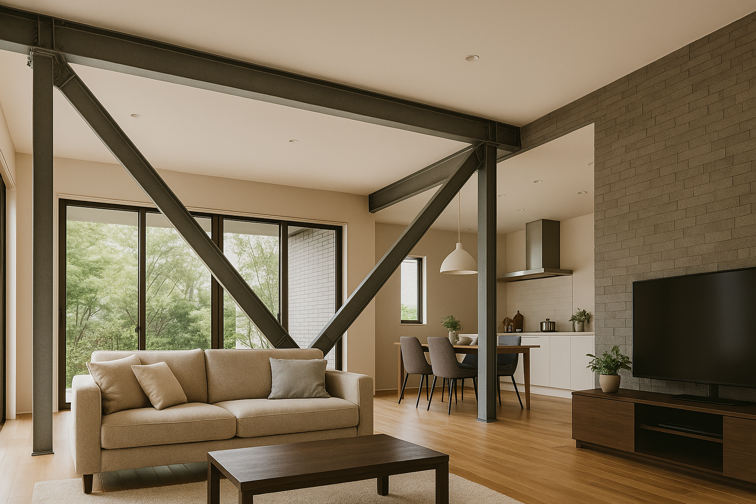 (※重量鉄骨の「フレキシブルβシステム」はラーメン構造なのでブレースはありませんが、柱と梁の接合部などが重要になるため、やはり大規模な変更には制約があります。)