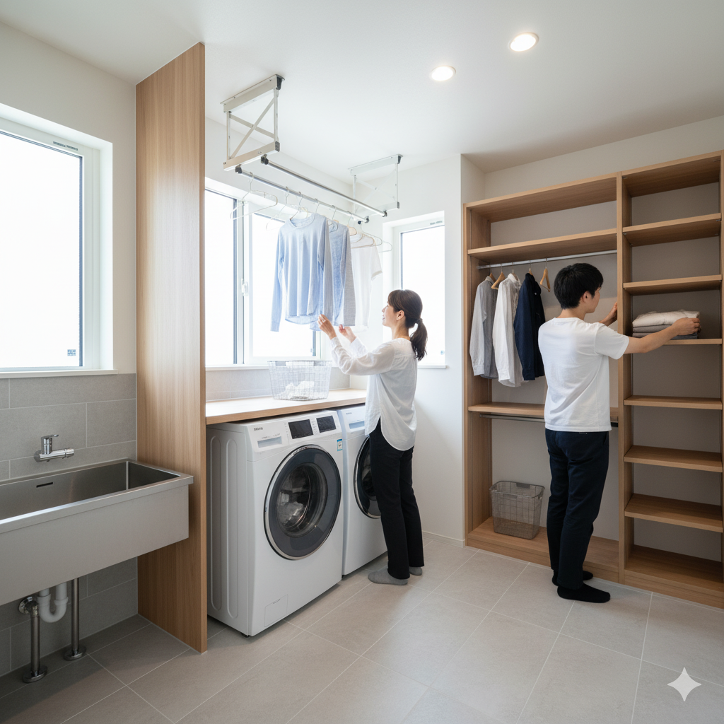 - 「しまう」:乾いた洗濯物を、どこにしまうか?理想的なのは、ランドリールームのすぐ隣に「ファミリークローゼット」がある配置です。これなら、ハンガーのまま移動するだけで収納完了。「畳む」という工程すらカットできます。