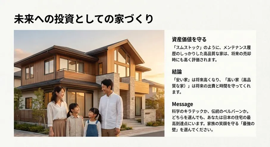 外装材選びの判断基準は、単なる「今の好み」だけでなく、「将来の自分にいくら残せるか」という投資的な視点を持つべきです。