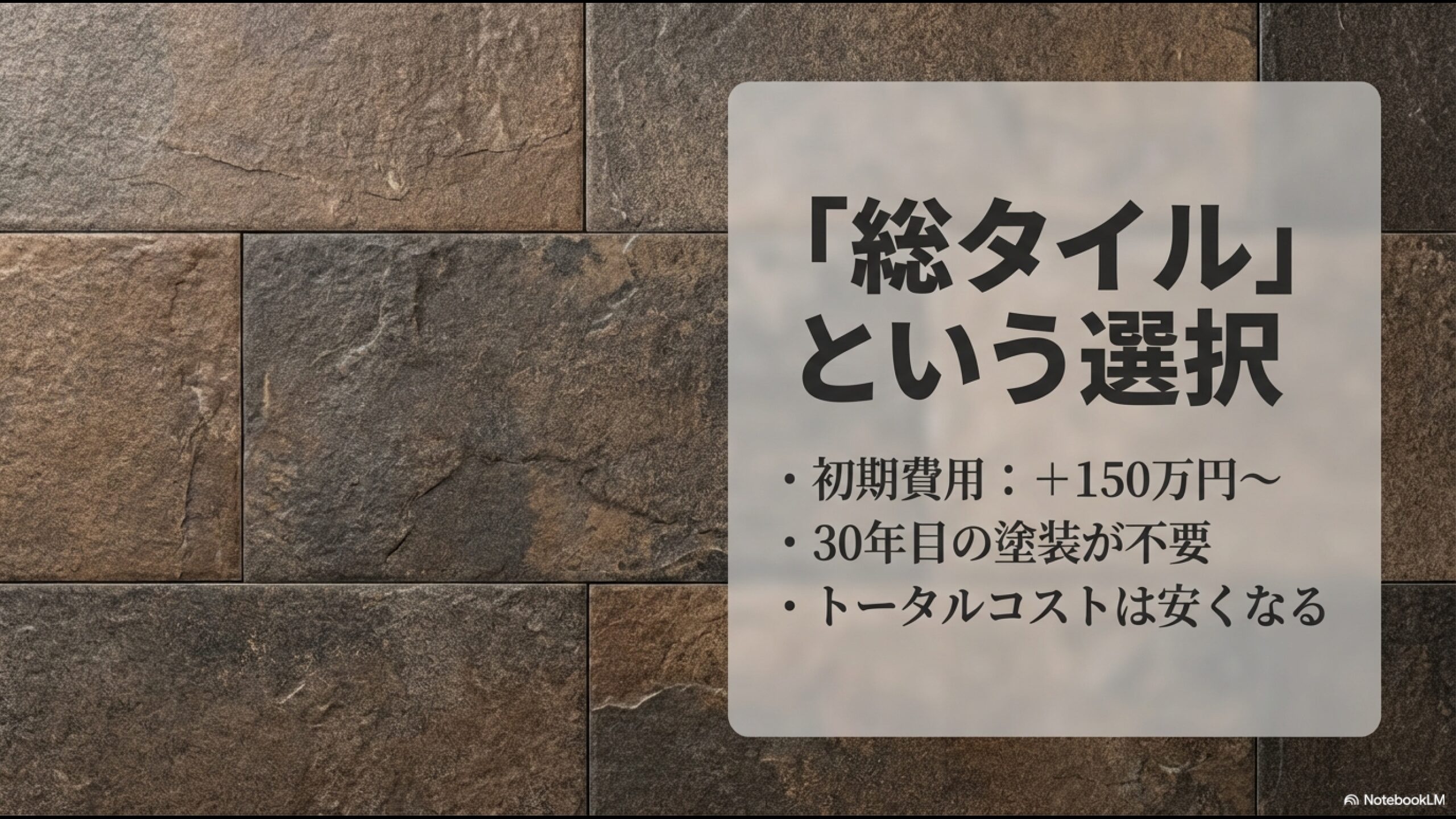 一方で、「家は資産であり、ランニングコストは最小限に抑えたい」という価値観であれば、タイル仕様や他メーカーを検討すべきです。