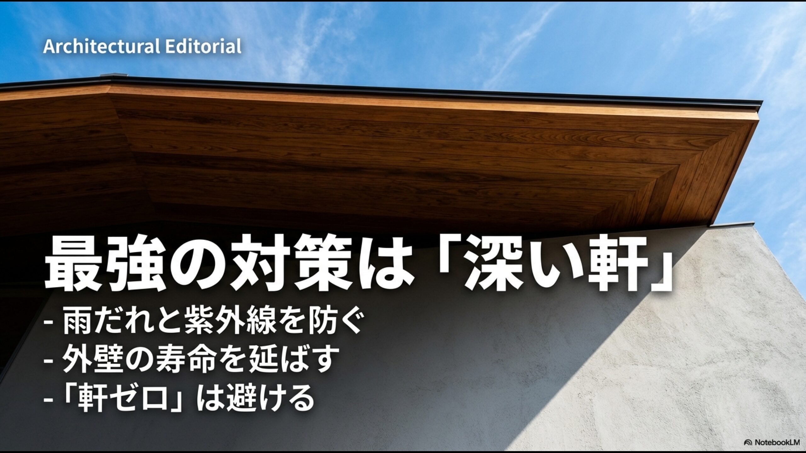- 「深い軒」と「木目調軒天」は、デザインだけでなく外壁保護の観点からも推奨される住友林業の必須アイテム。