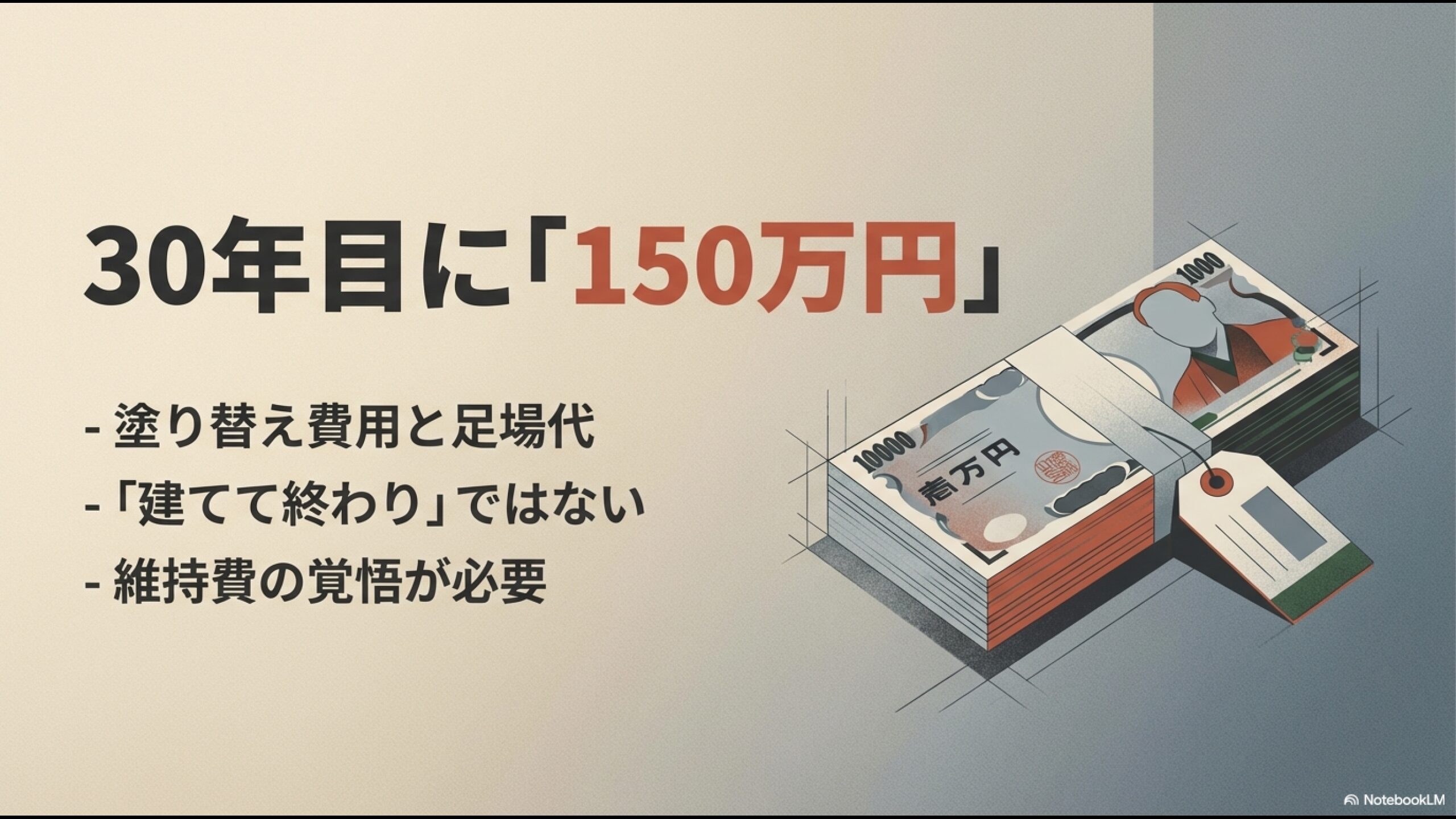 - 住友林業の標準である「塗り壁(シーサンドコート)」は、唯一無二の美しさと高級感があるが、30年目に約150万円〜の再塗装費用と足場代が必要になる。