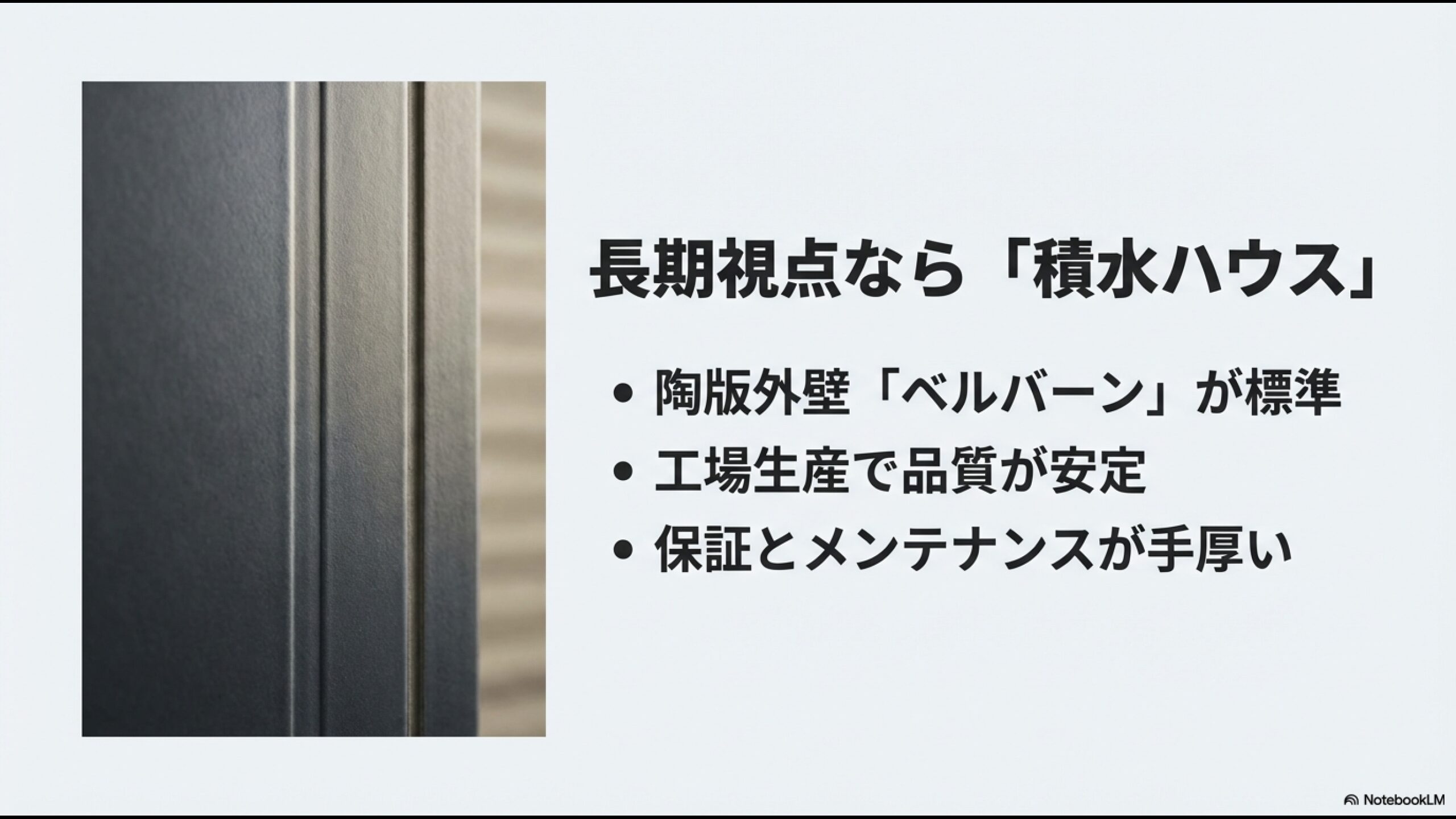 しかし、もしあなたが「意匠性」と同じくらい、あるいはそれ以上に「長期的なメンテナンスコストの削減」や「将来の安心感」を優先順位の上位に置いているのであれば、私が最終的にパートナーとして選んだ「積水ハウス」も、比較検討のテーブルに一度乗せてみることを強くお勧めします。