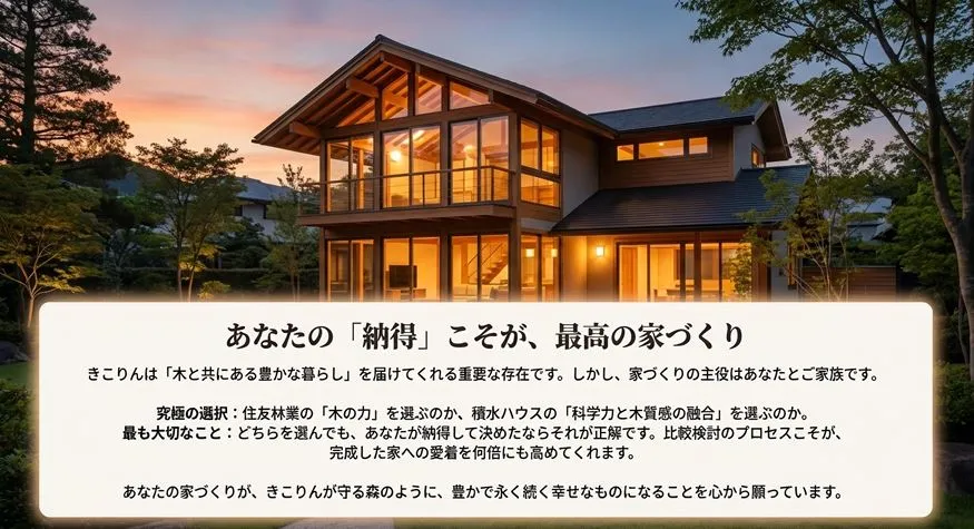 その上で、住友林業の性能に納得できればきこりんをパートナーに選べば良いですし、積水ハウスの性能に惹かれるのであれば、キャラクターはグッズとして楽しみ、家本体は積水ハウスで建てるという「ハイブリッドな満足」の形も十分にあり得ます。