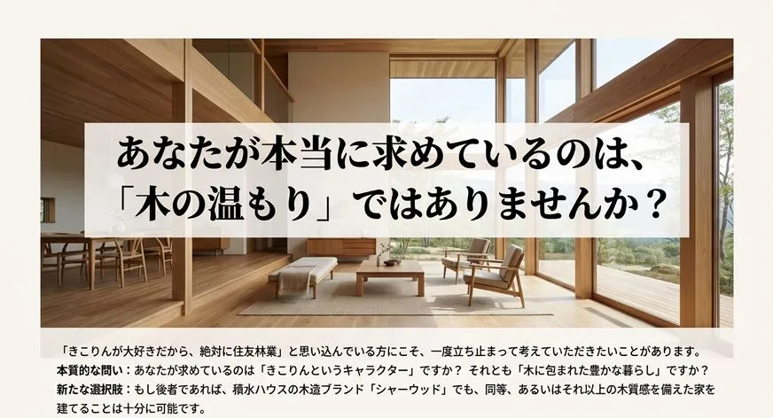 「きこりんが大好きだから、絶対に住友林業じゃないとダメだ!」と思い込んでいる方にこそ、ぜひ一度立ち止まって考えていただきたいことがあります。