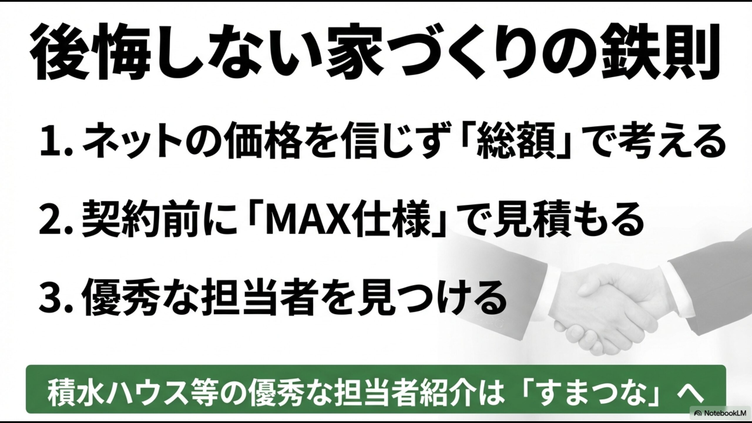 後悔しない家づくりの鉄則。ネット価格を信じない、契約前にMAX仕様で見積もる、優秀な担当者を見つける。