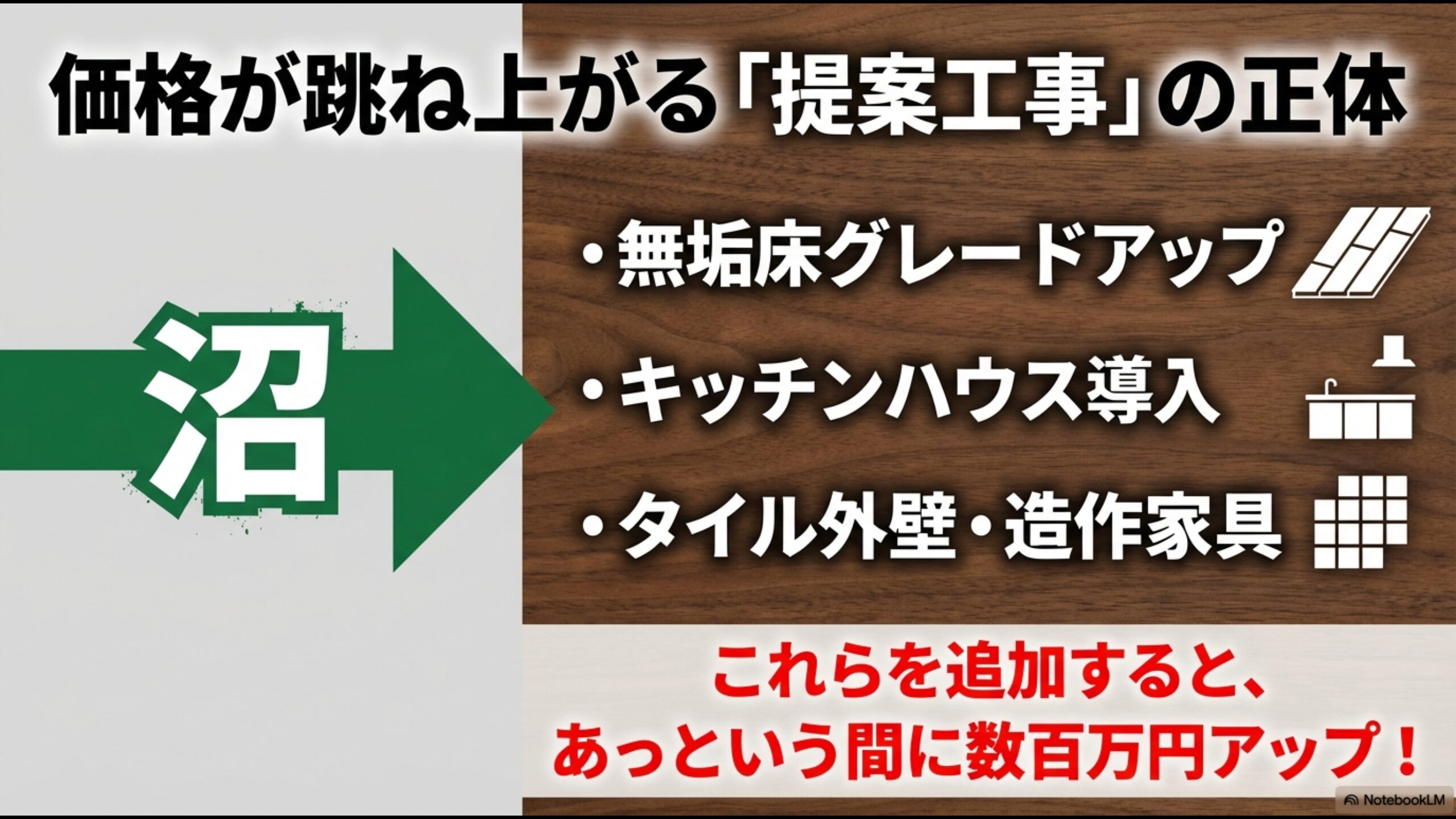 価格が跳ね上がる提案工事の正体。キッチンハウスや無垢床グレードアップで数百万円アップする沼。