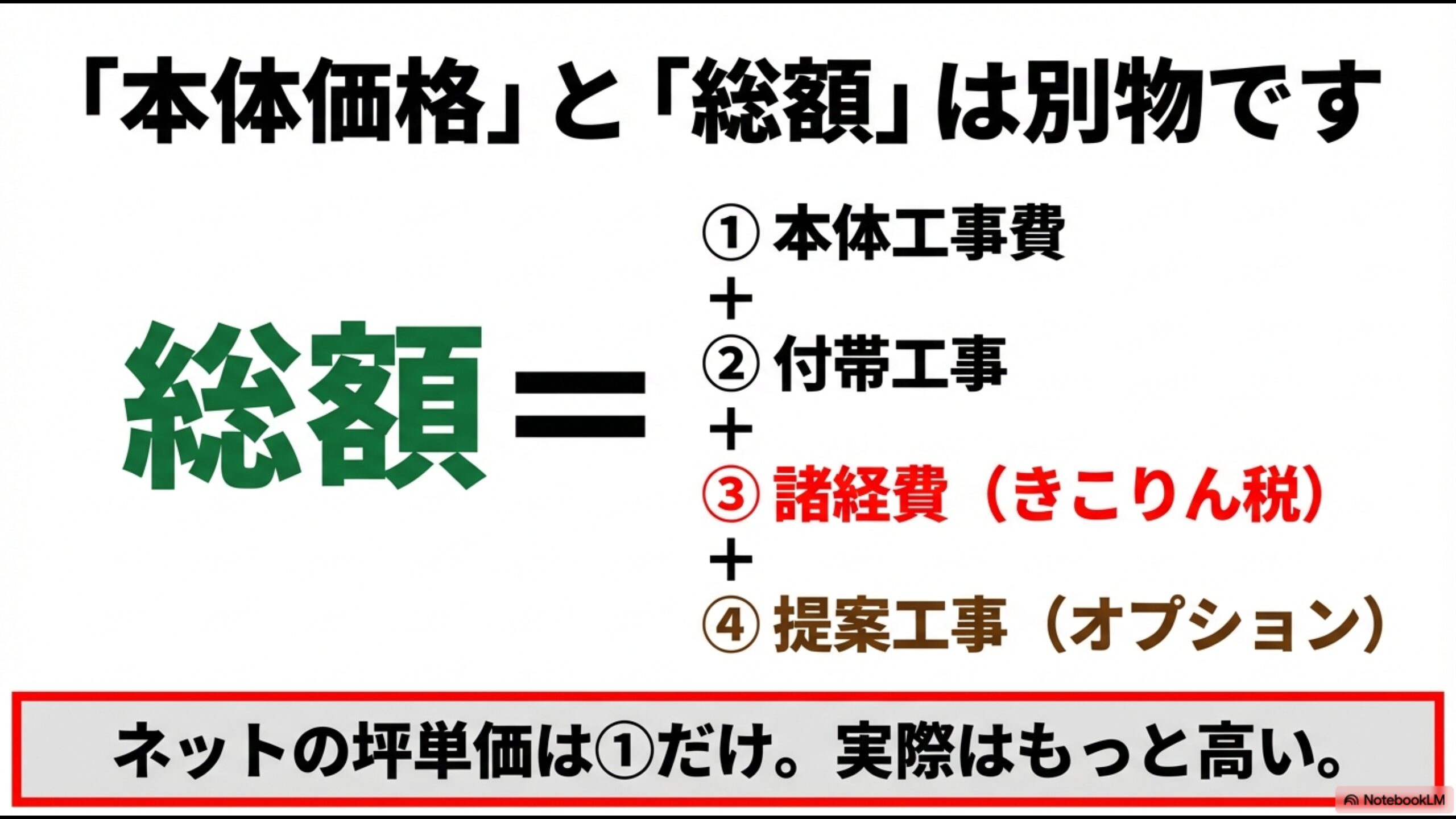 住友林業の総額は本体工事費、付帯工事、諸経費、提案工事の合計である図解