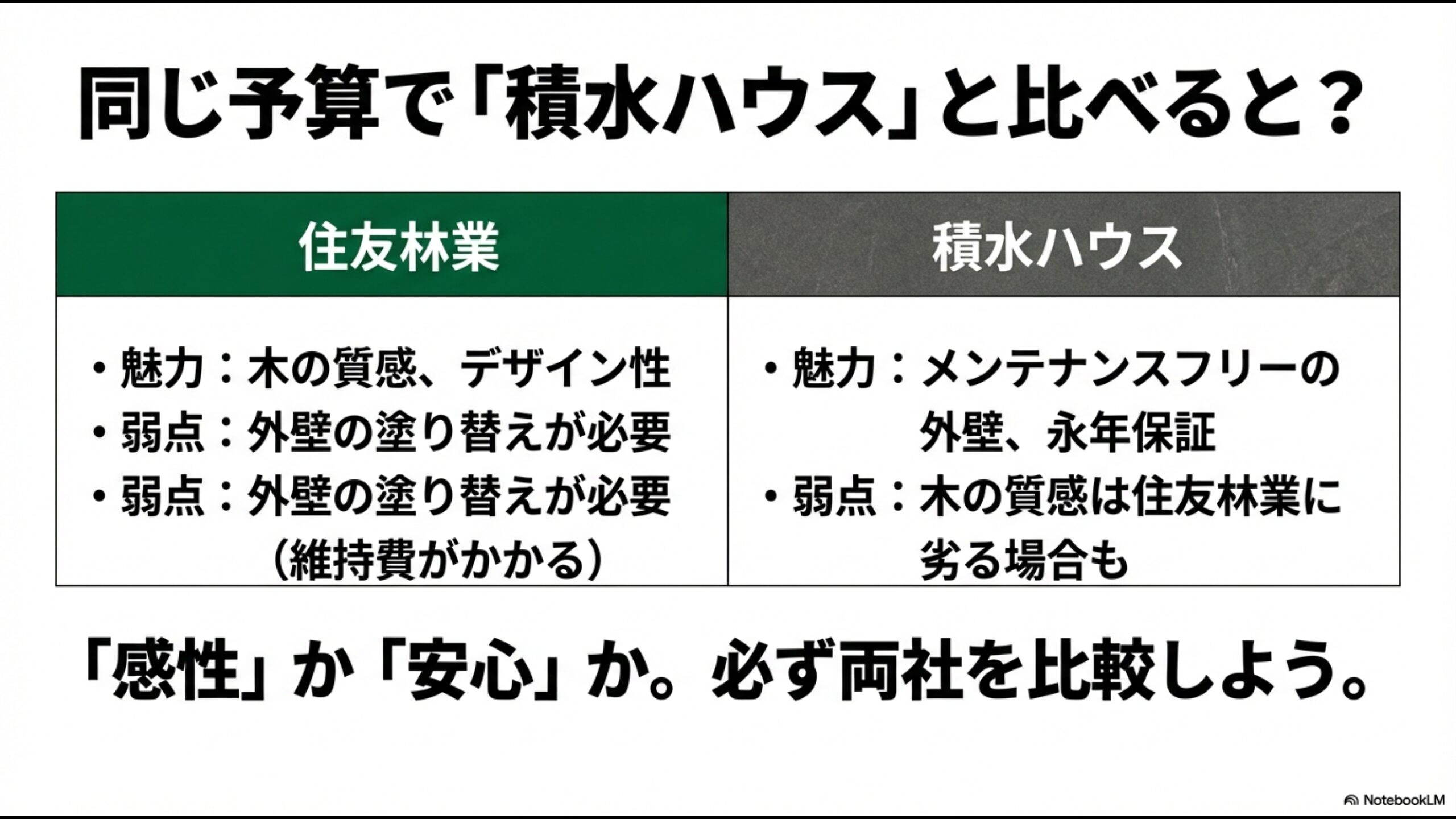 住友林業の木の質感と積水ハウスのメンテナンスフリー外壁、それぞれの魅力と弱点の比較表
