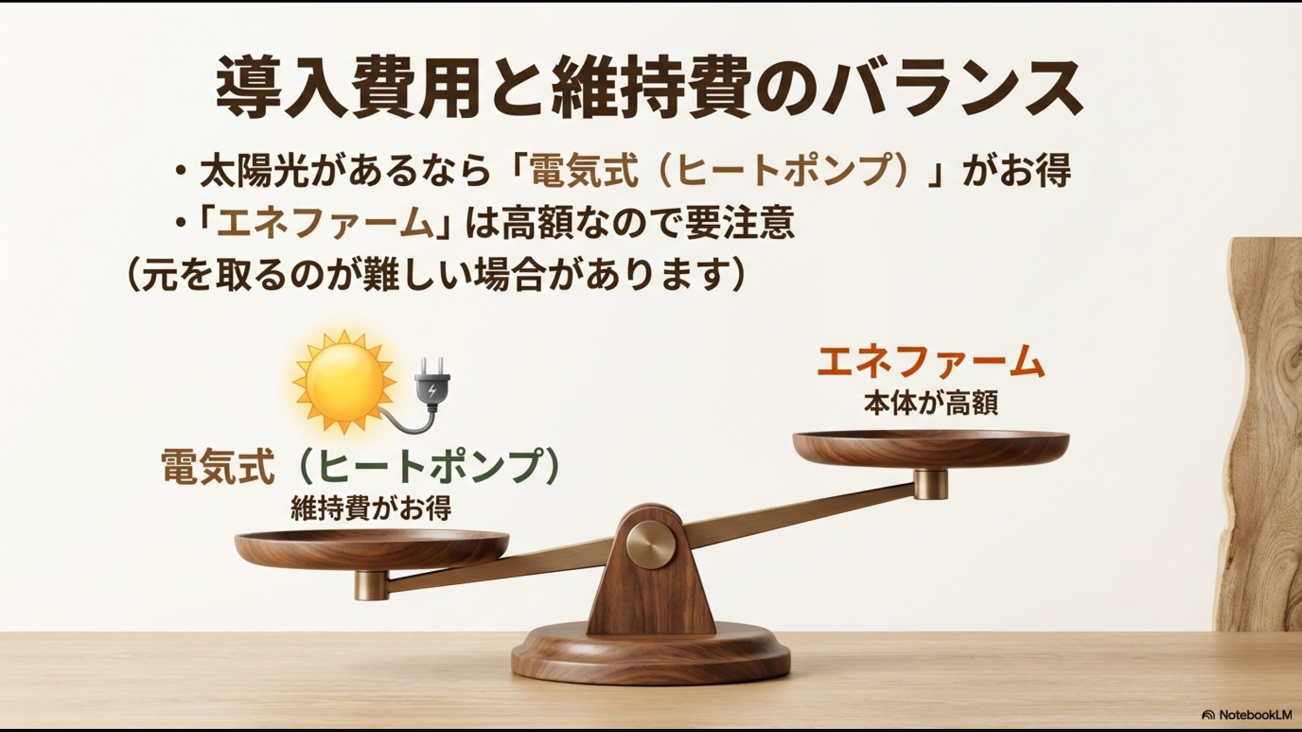 導入費用と維持費のバランス。太陽光があるなら電気式(ヒートポンプ)がお得。エネファームは高額なので注意