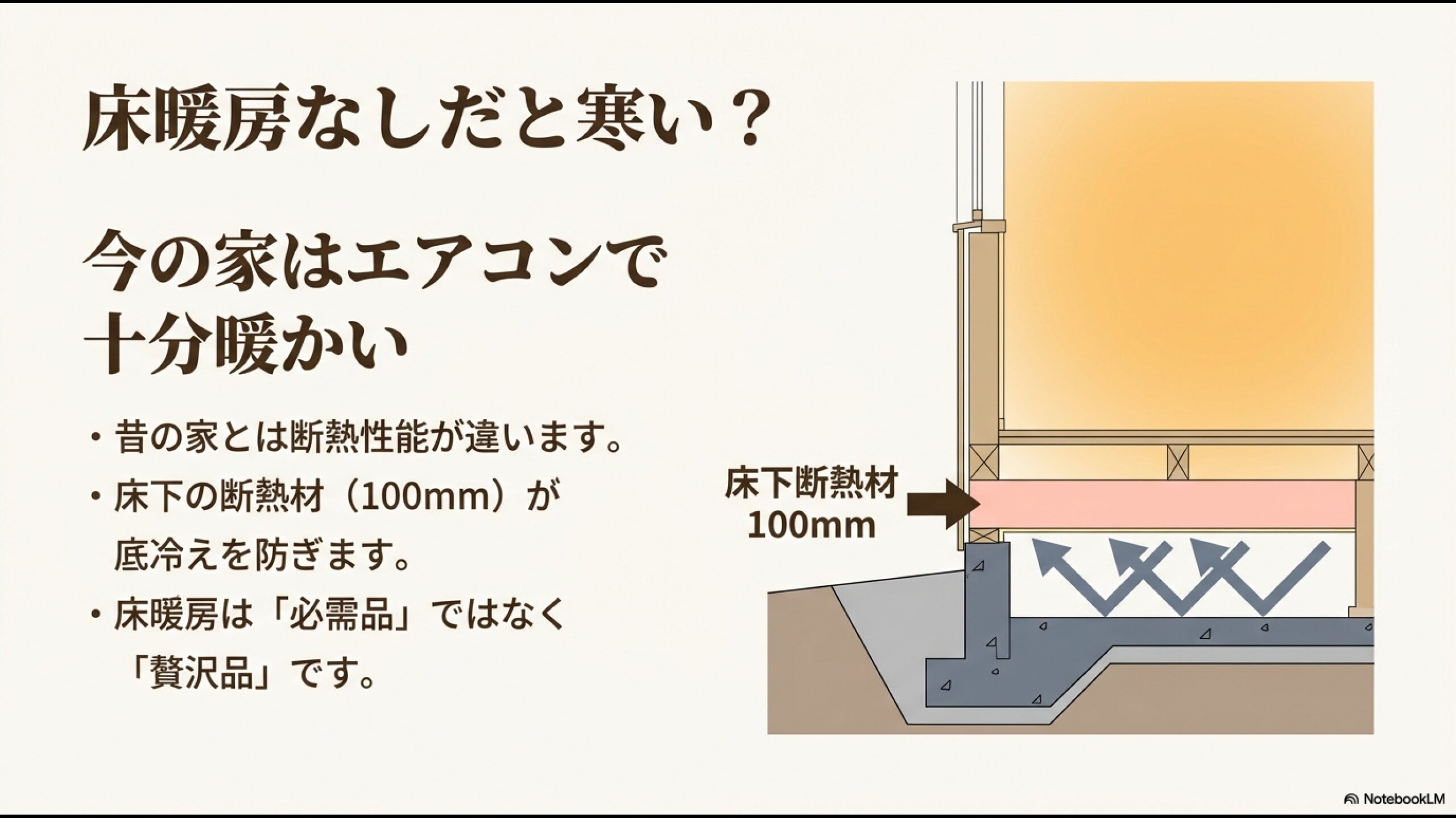 「床暖房がないと寒くて住めない家」ではなく、「床暖房がなくても暖かいけれど、あるともっと幸せな家」を目指すべきです。