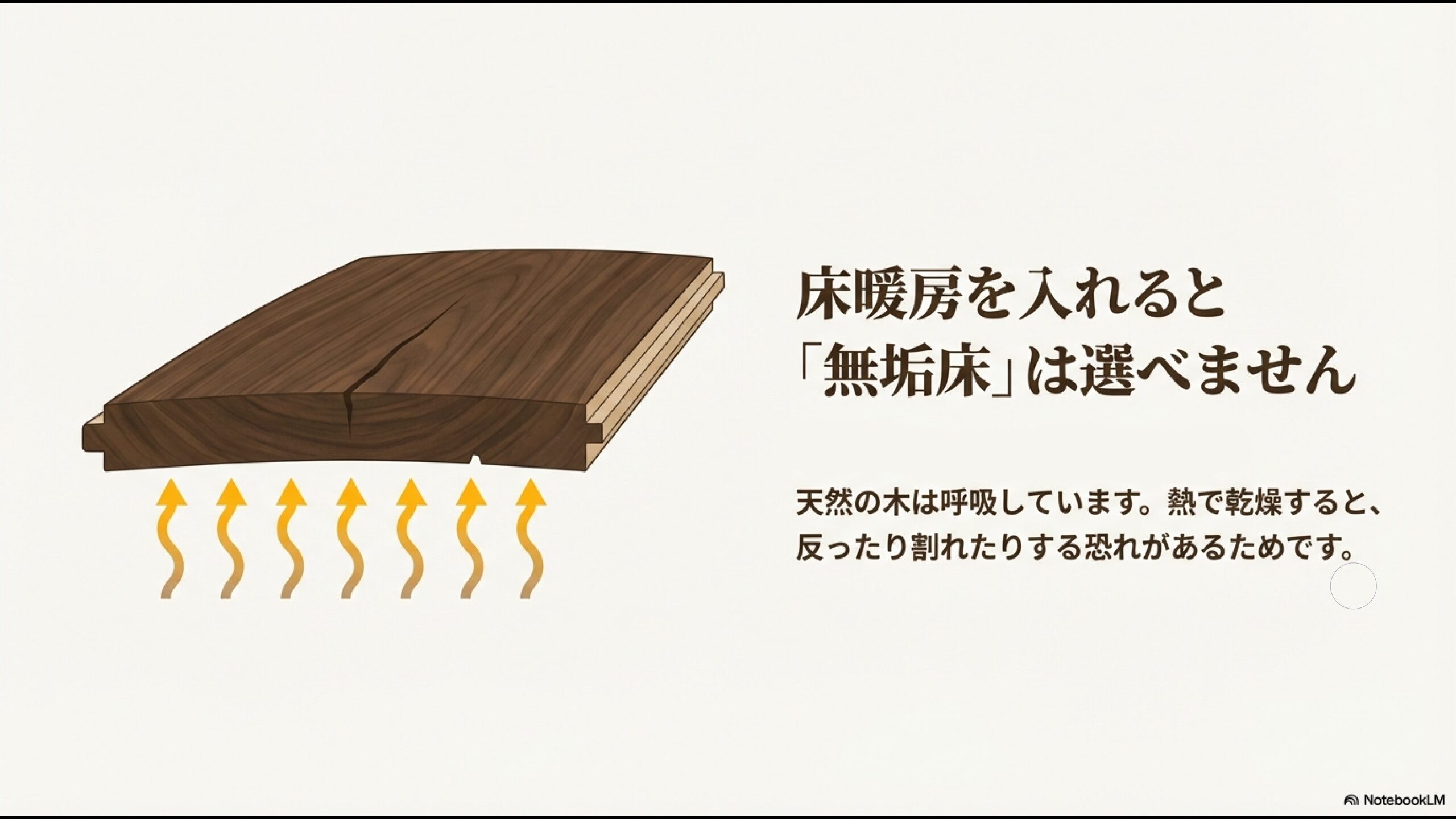 営業担当者の方も、最初のうちは「床暖房もできますよ!」と明るく言いますが、詳しく話を聞いていくと「ただし、床暖房エリアは無垢床が選べなくなります(または樹種が極端に制限されます)」という事実を告げられることになります。