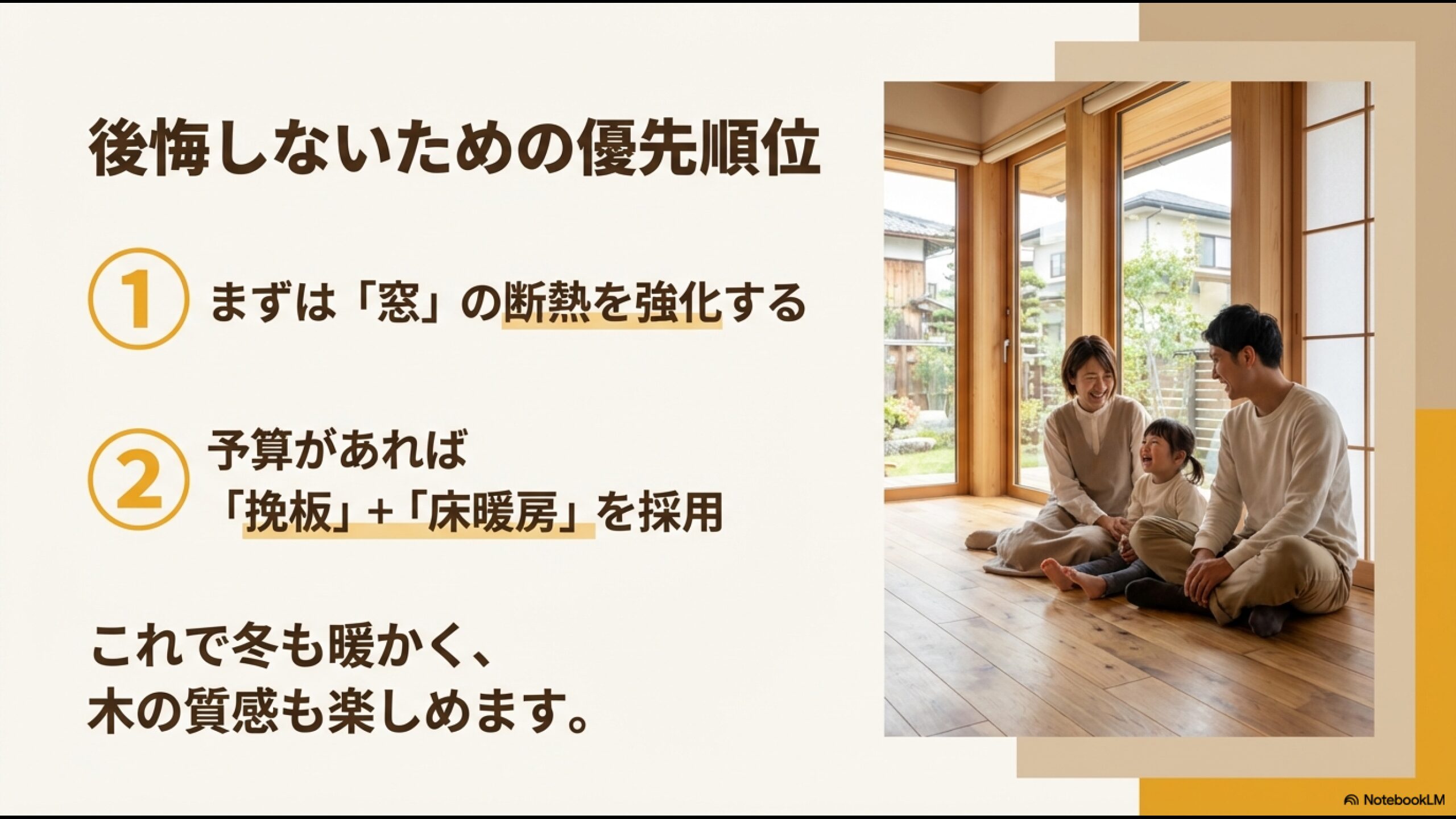 「まずは断熱性能(特に窓!)をしっかりと高めて、その上で予算に余裕があれば、さらなる快適性(ラグジュアリー)のために床暖房を入れる」