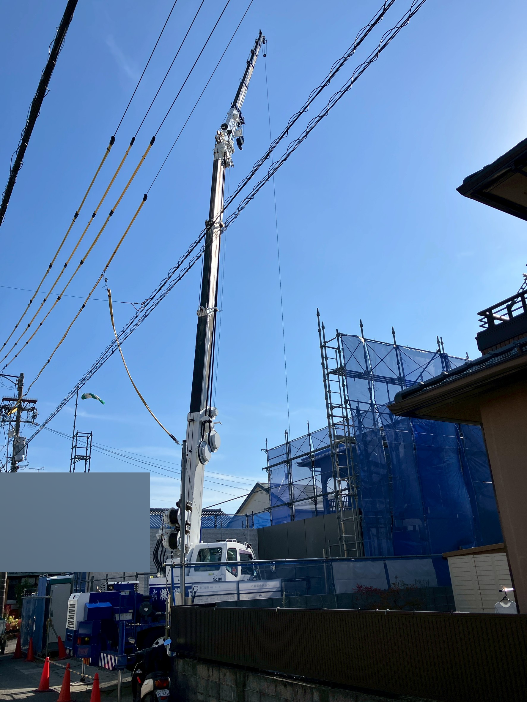 ▲壁パネルが空を飛んで、基礎の上へ運ばれていきます!