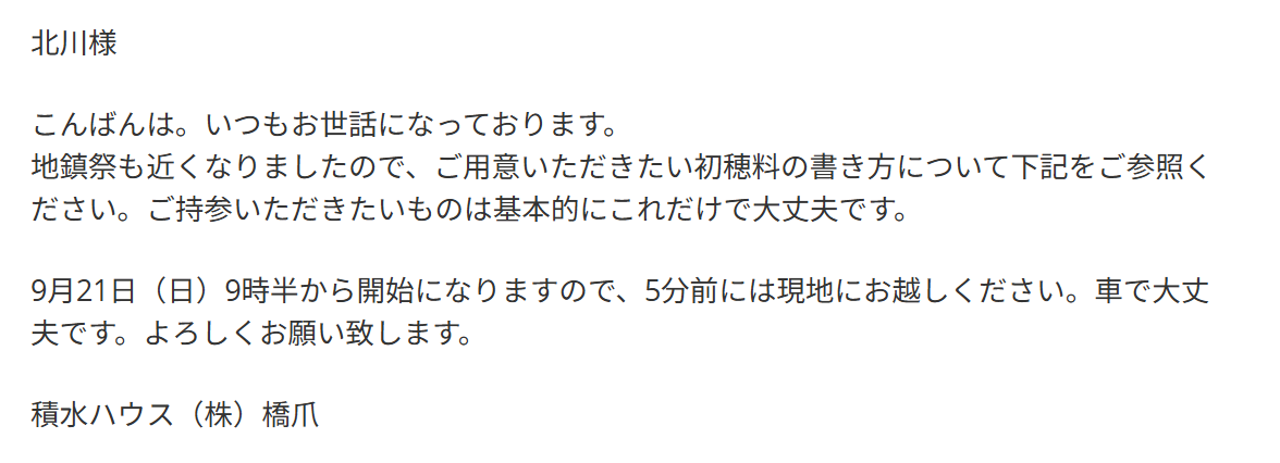 地鎮祭も近くなりましたので、ご用意いただきたい初穂料の書き方について下記をご参照ください。ご持参いただきたいものは基本的にこれだけで大丈夫です。9月21日(日)9時半から開始になりますので、5分前には現地にお越しください。車で大丈夫です。よろしくお願い致します。