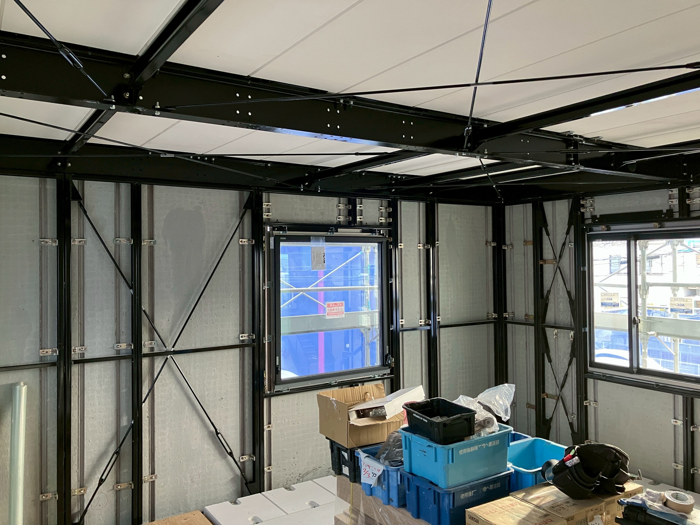 黒光りする強靭な鉄骨フレーム(ダイナミックフレーム・システム)が、縦横無尽に組み上げられています。