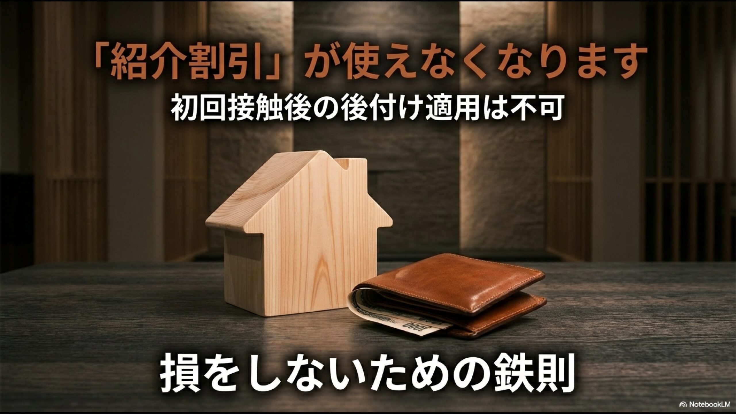 さらに致命的なのが、アンケート記入後(初回接触後)では、強力な「オーナー紹介割引」などの優遇制度が原則として使えなくなってしまうという事実です。
