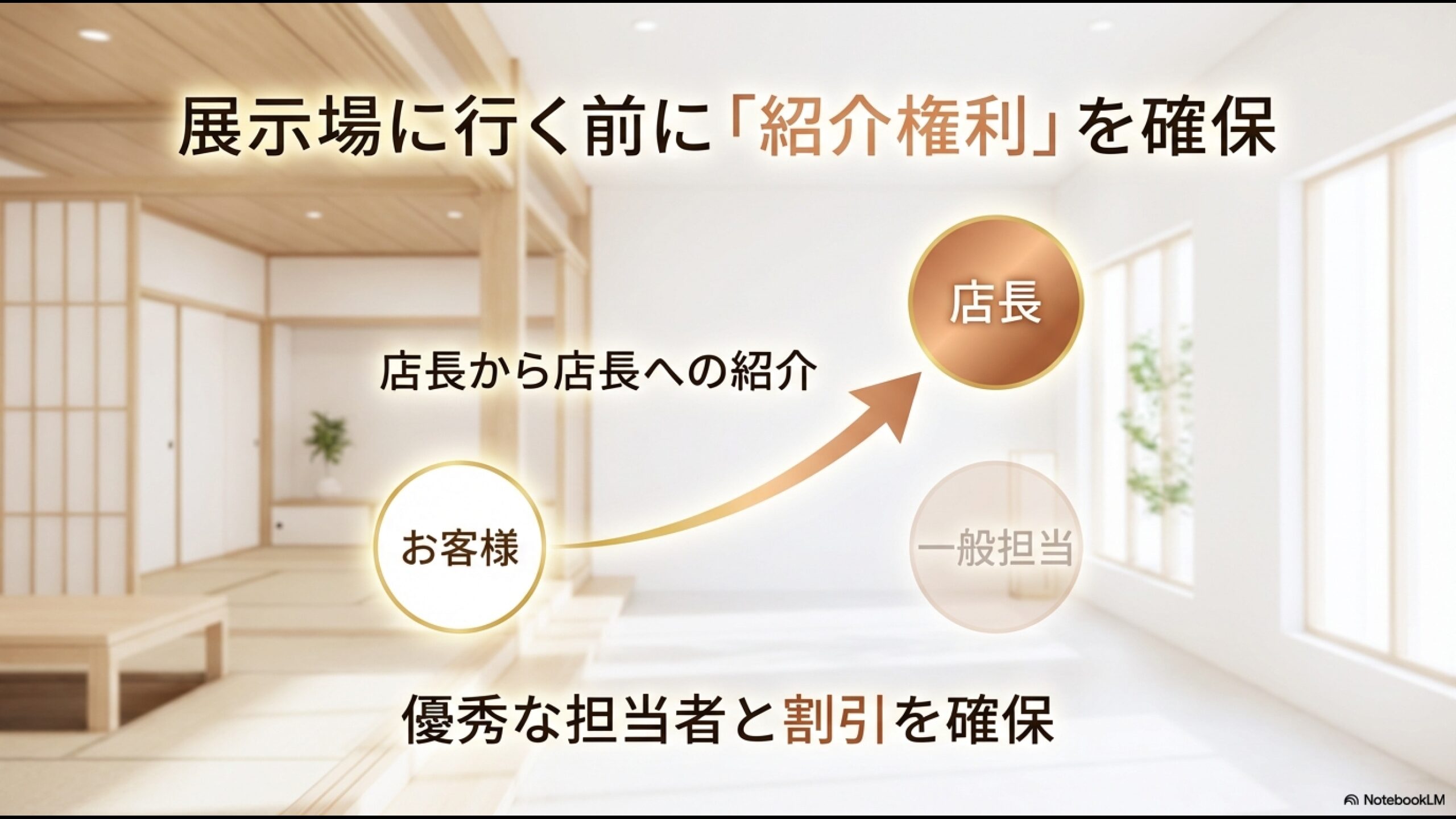 ハウスメーカー側からすれば、すでに自力で展示場に足を運んでくれたお客様(=既存顧客)に対して、わざわざ後付けで高額な紹介割引を適用する理由がありません。