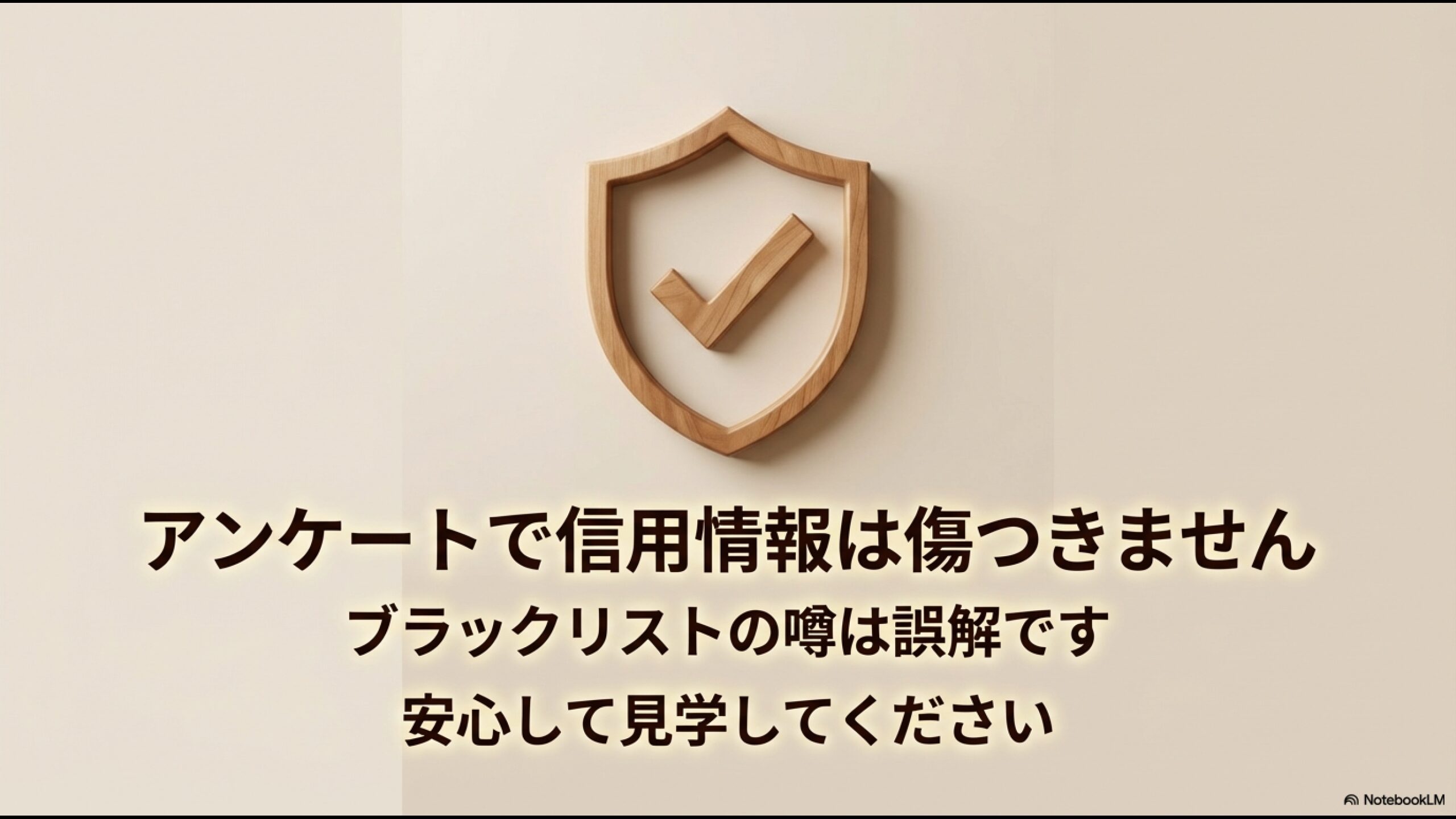 ところで、インターネット上の噂やSNSなどで「住宅展示場に行ってアンケートを書いただけで、信用情報のブラックリストに載ってしまうのでは?」と心配される方が稀にいらっしゃいますが、ここでハッキリと断言します。