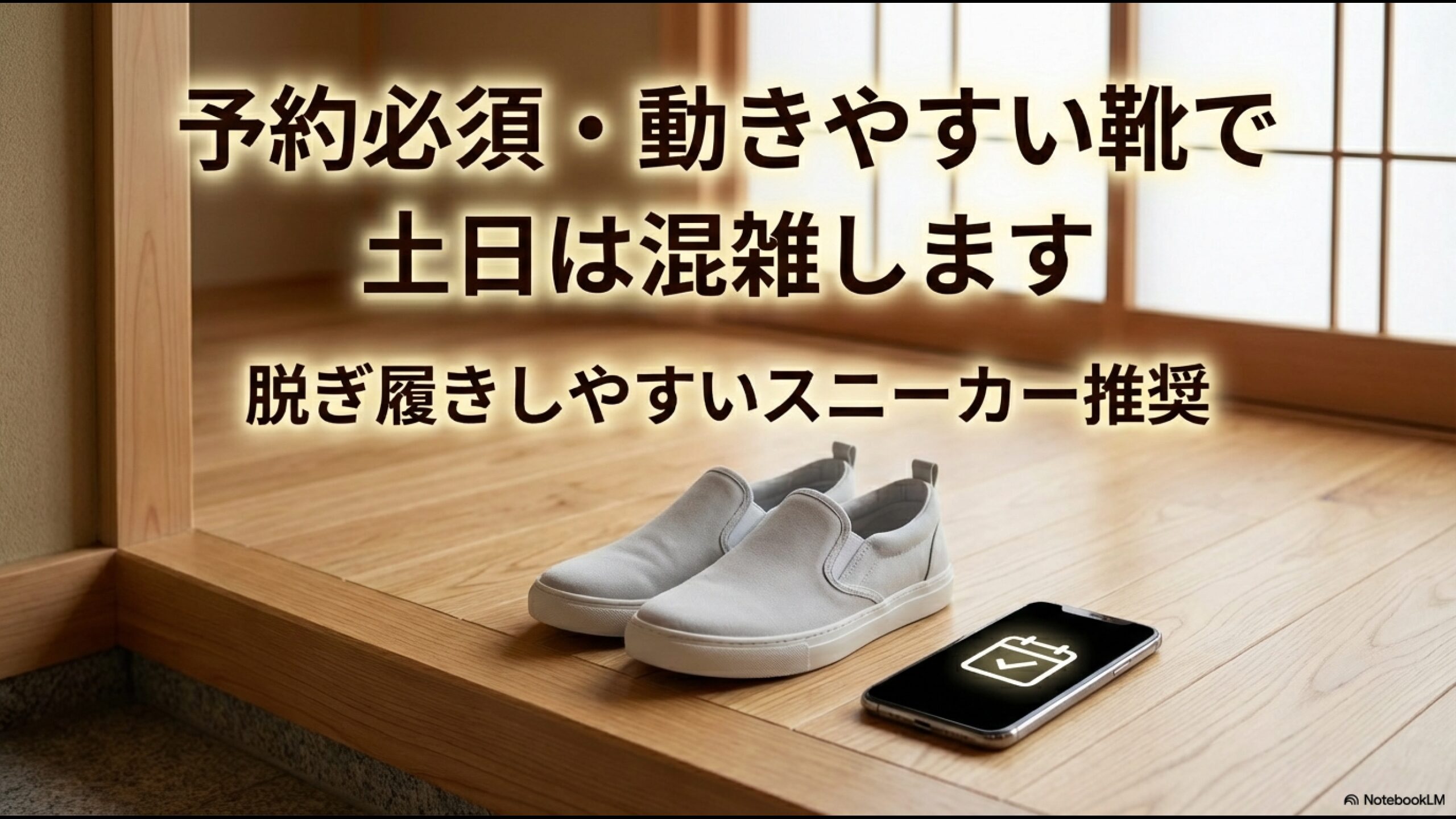 そのため、編み上げのブーツや脱ぎ履きしにくい革靴は避け、スニーカーやスリッポンなど、サッと脱ぎ履きできる靴で行くことを強くお勧めします。